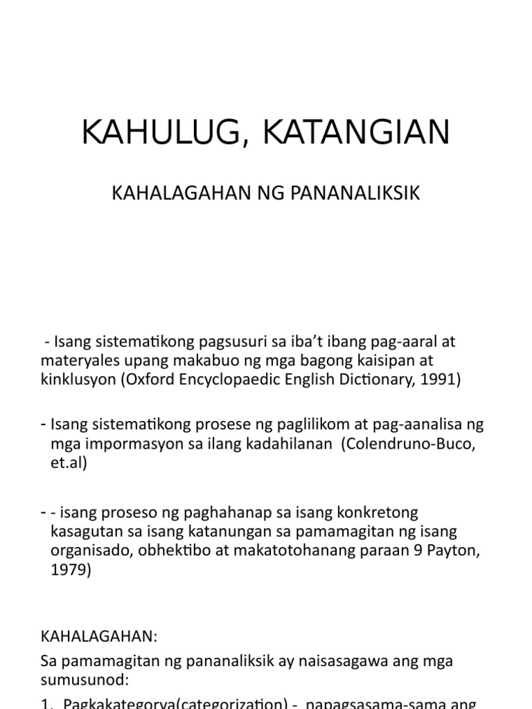 Kahulugan ng mga katawagan iii. Sulating pananaliksikbatayang kaalamanisang komprehensibong gawain ang pananaliksik. Kungkaya't marapat lang na tiyaking nasa pinakamainam na ayos ang mga ideya sa iyong panghuling balangkas upang hindi ka mahirapan sa pagsulat ng iyong papel ng pananaliksik. Kasunod ang mga pamamaraan ng paglikom ng mga datos at impormasyon, ang mga nalikom na datos ay iaayos, susuriin, bibigyan ng interpretasyon, at ialapatan ng kongklusyon. Start studying 4th qtr pagbasa at pagsusuri ng iba't ibang teksto tungo sa pananaliksik.